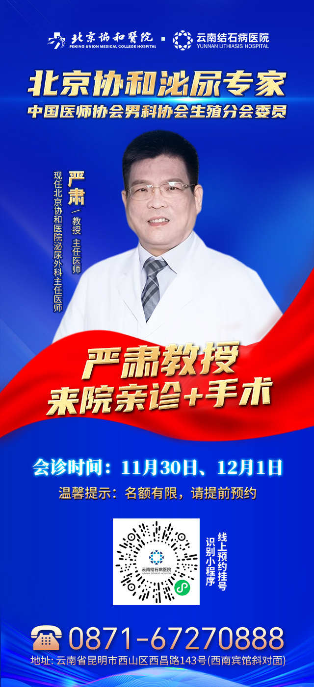 泌尿结石、前列腺增生【福音】:为保障广大群众的就医需求,让春城百姓在家门口享受到顶尖医疗服务,我院特邀北京协和医院泌尿专家严肃教授来院坐诊。